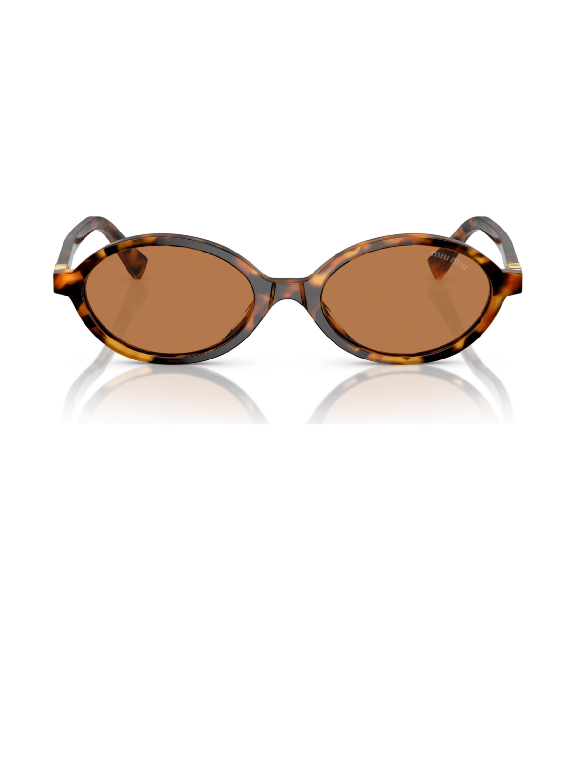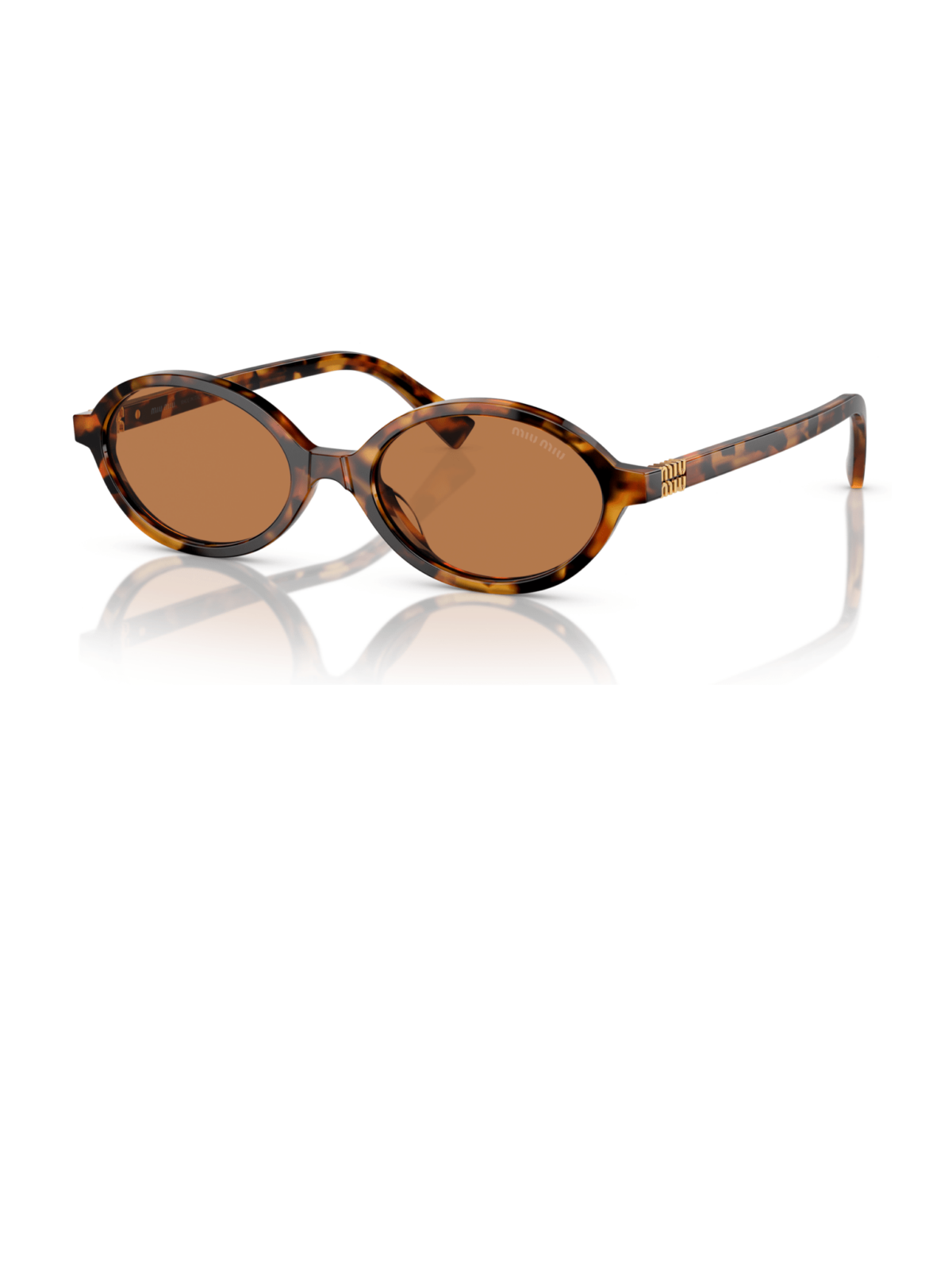 Хит от бренда Miu Miu в форме овала, в роговой оправе с коричневой линзой.