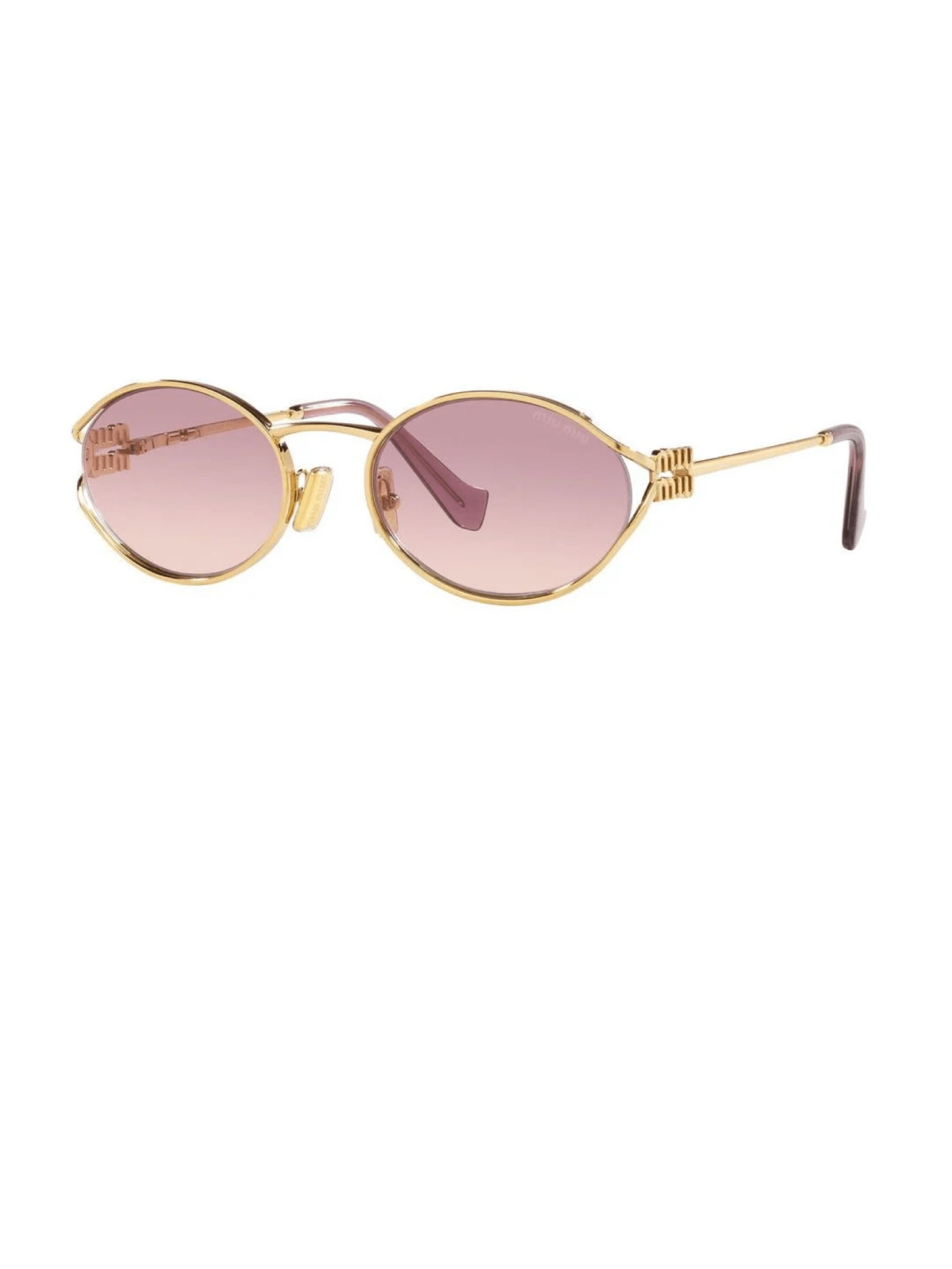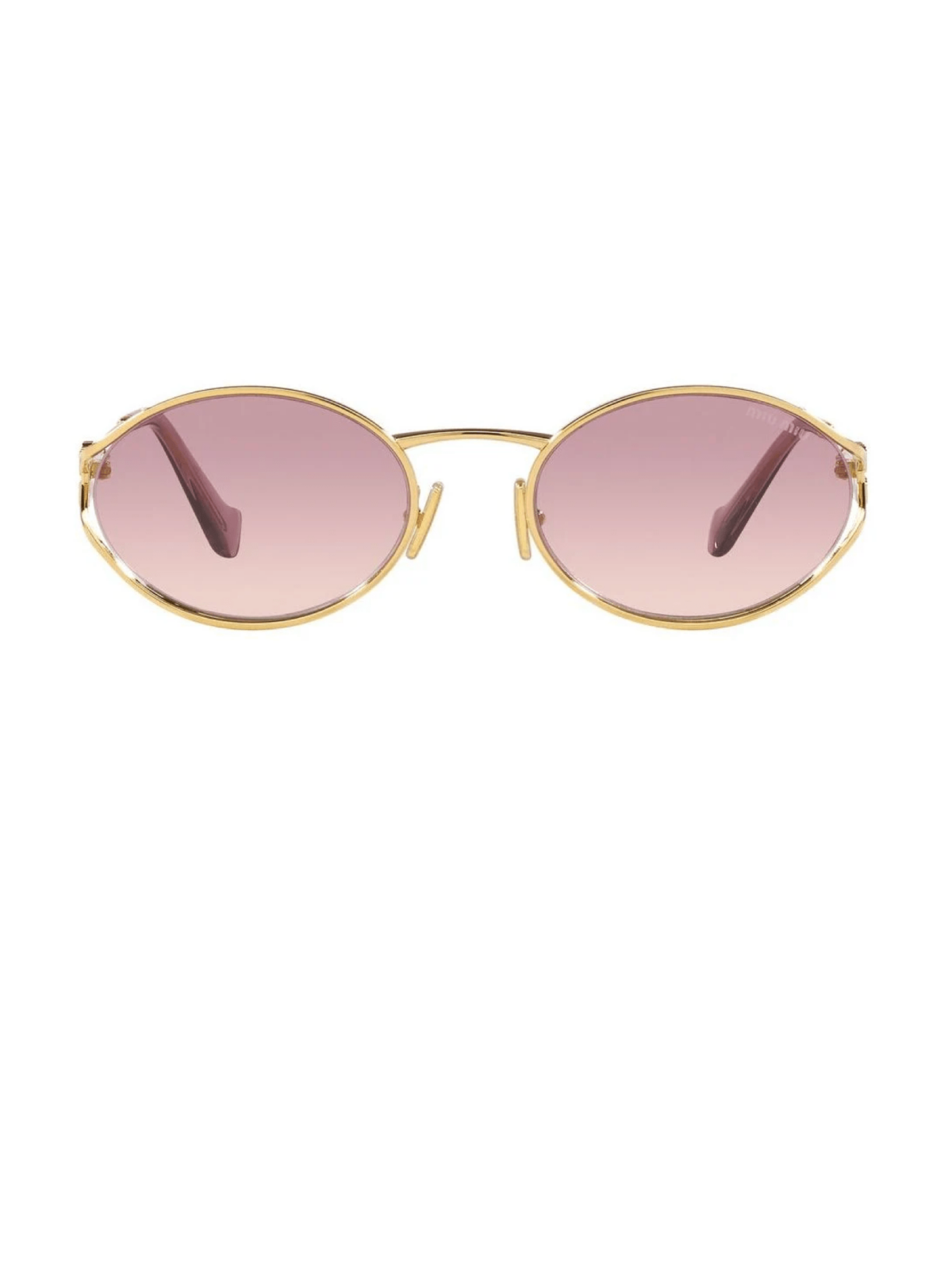 Модель от Miu Miu овальной формы в металлической оправе золотого цвета с розовой, градиентной линзой.