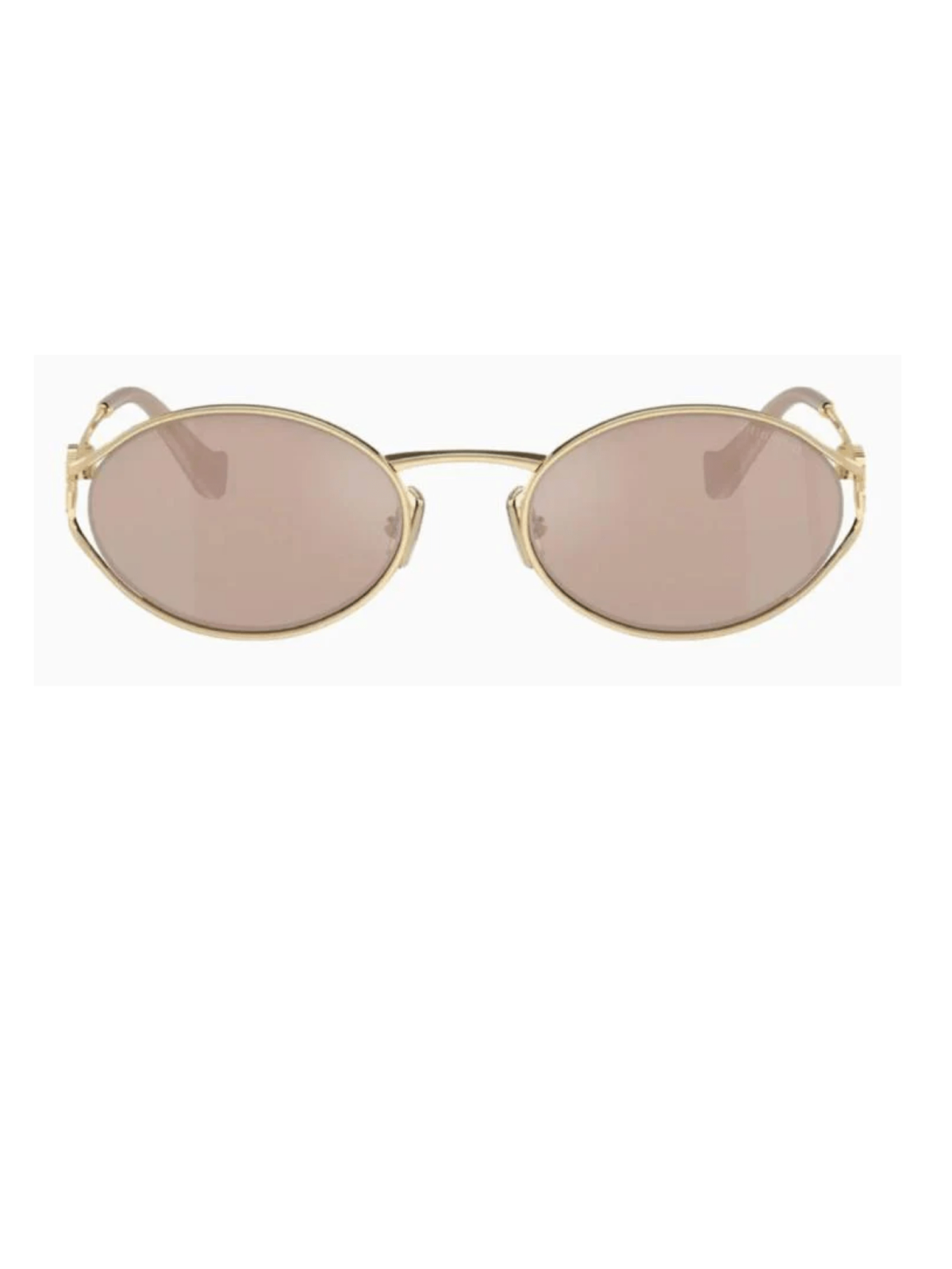 Модель от Miu Miu овальной формы в металлической оправе золотого цвета с розовой линзой.