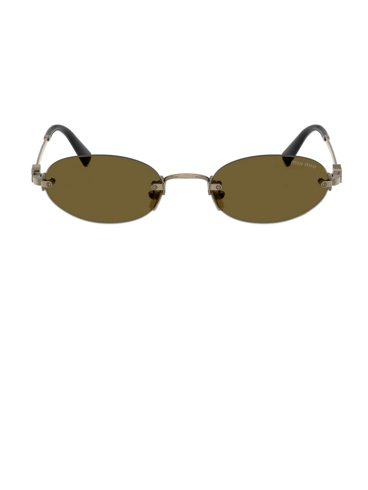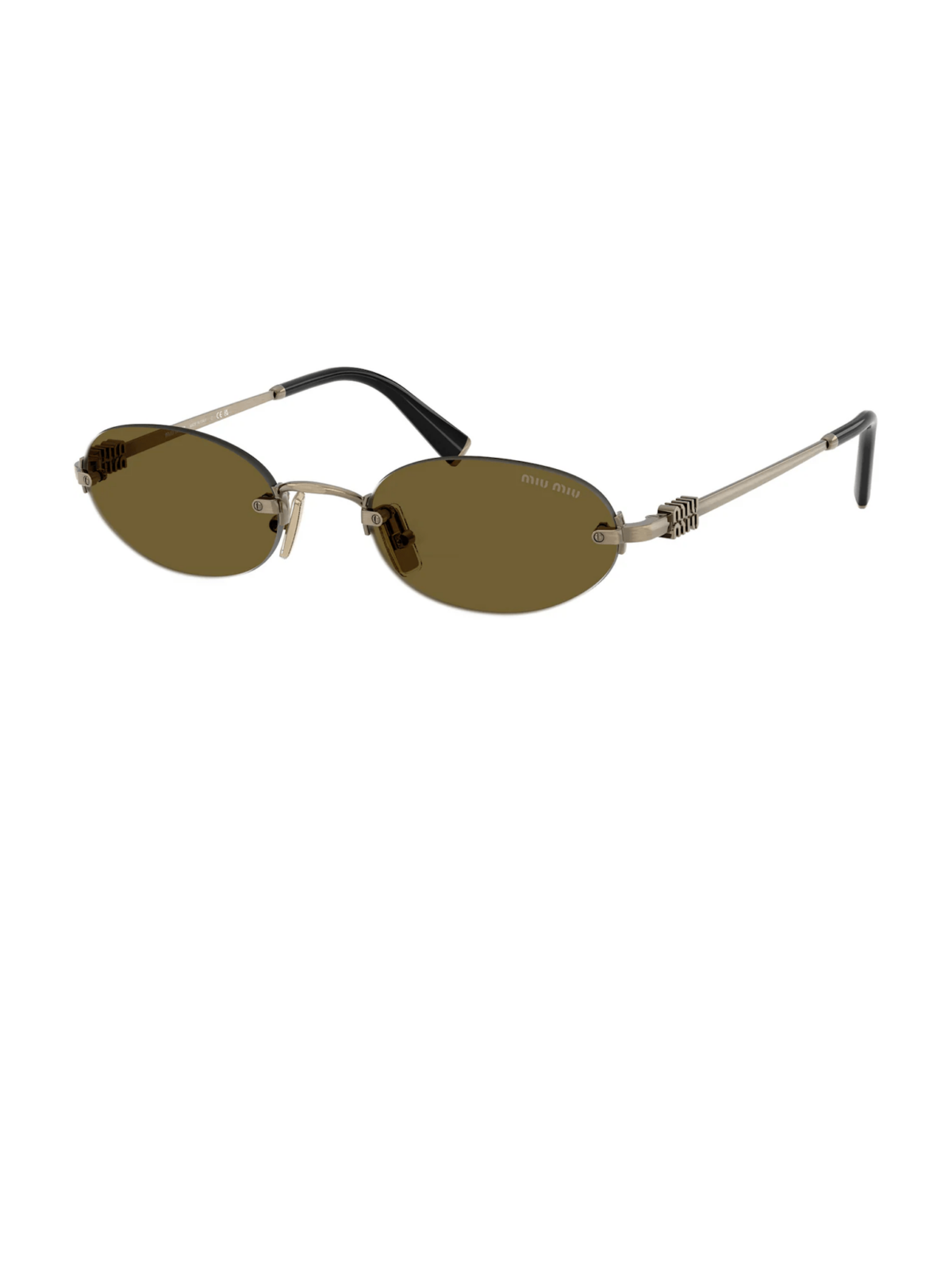 Модель имеет безобедочный овальный силуэт с плавными очертаниями. Оправа выполнена из металла в оттенке старого золота. Линзы темнокоричневого цвета. Дужки тонкие, с минимальным декоративным акцентом.