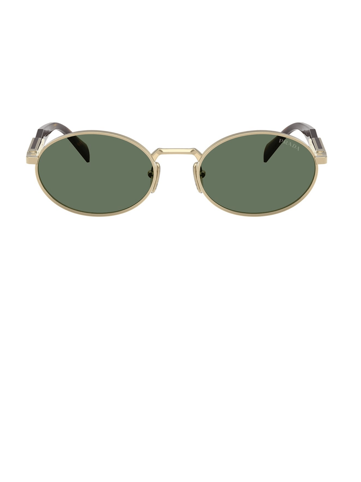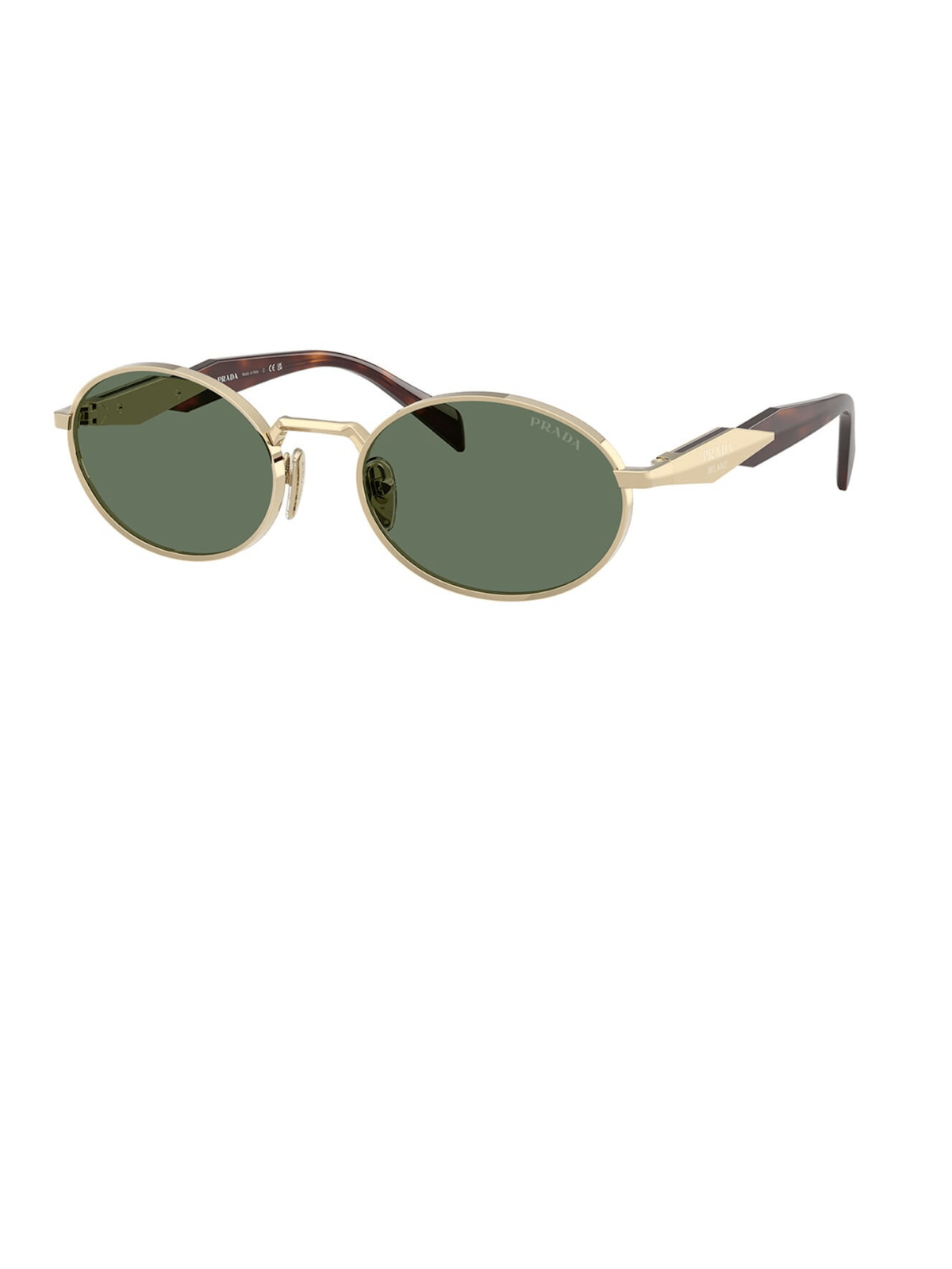 Модель с овальным силуэтом и полной металлической оправой в светло-золотистом оттенке. Линзы выполнены в зеленом тоне, что мягко подчеркивает форму. Скобки имеют аккуратные ацетатные вставки и фирменную маркировку Prada. Очки смотрятся современно и универсально для ежедневного ношения.