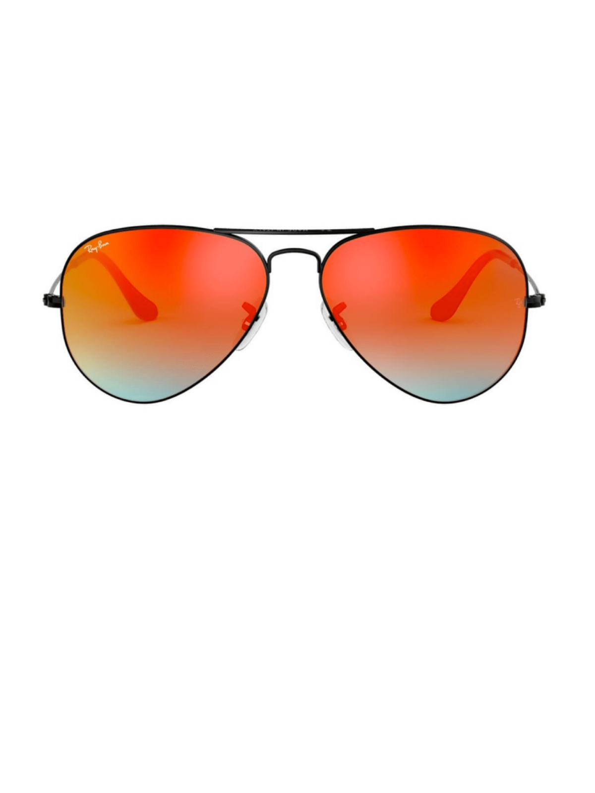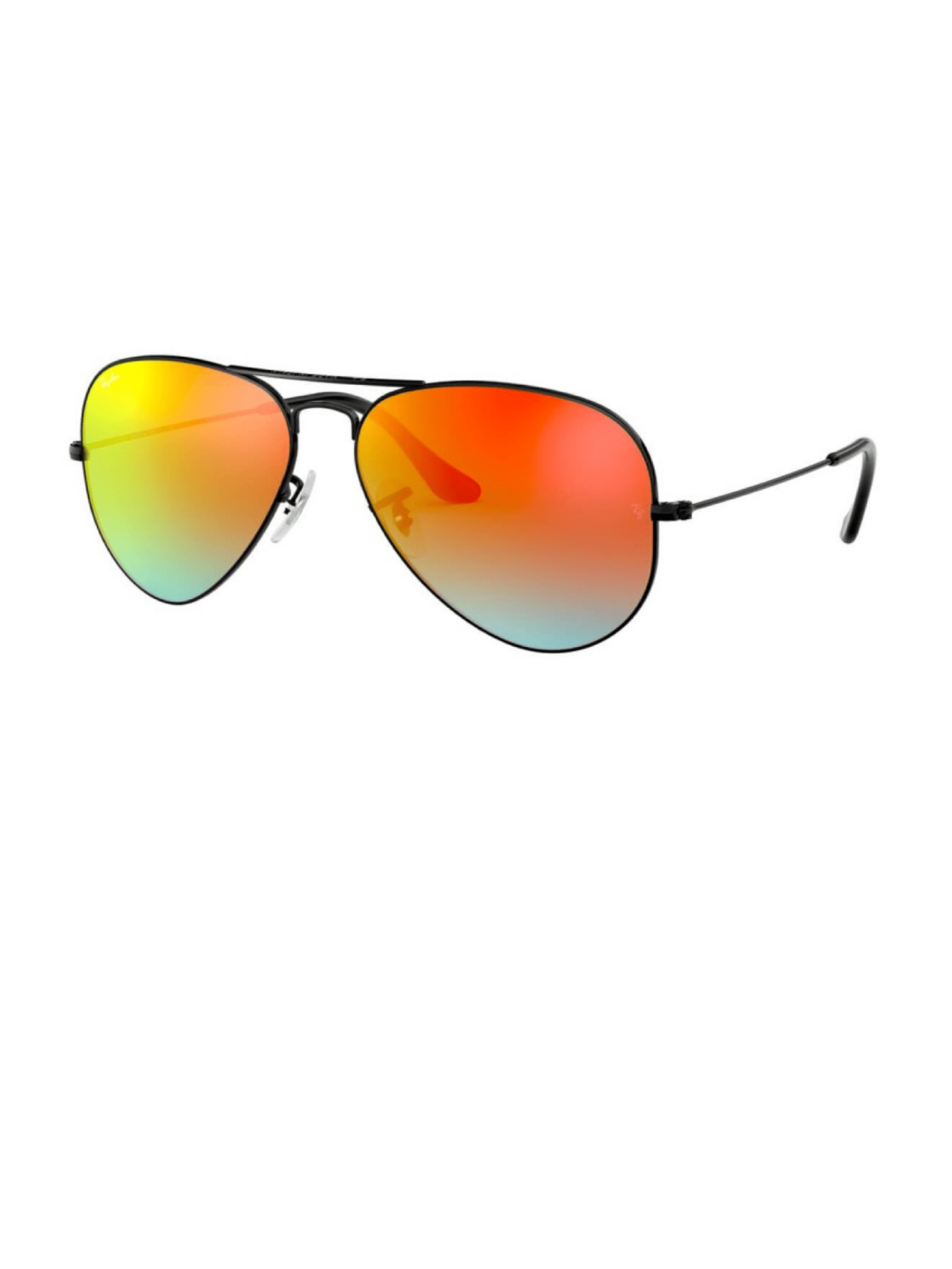 Модель в форме авиатора, в черном цвете оправы с серой, градиентной линзой с зеркальным оранжевым напылением. Модель без оригинальной комплектации.