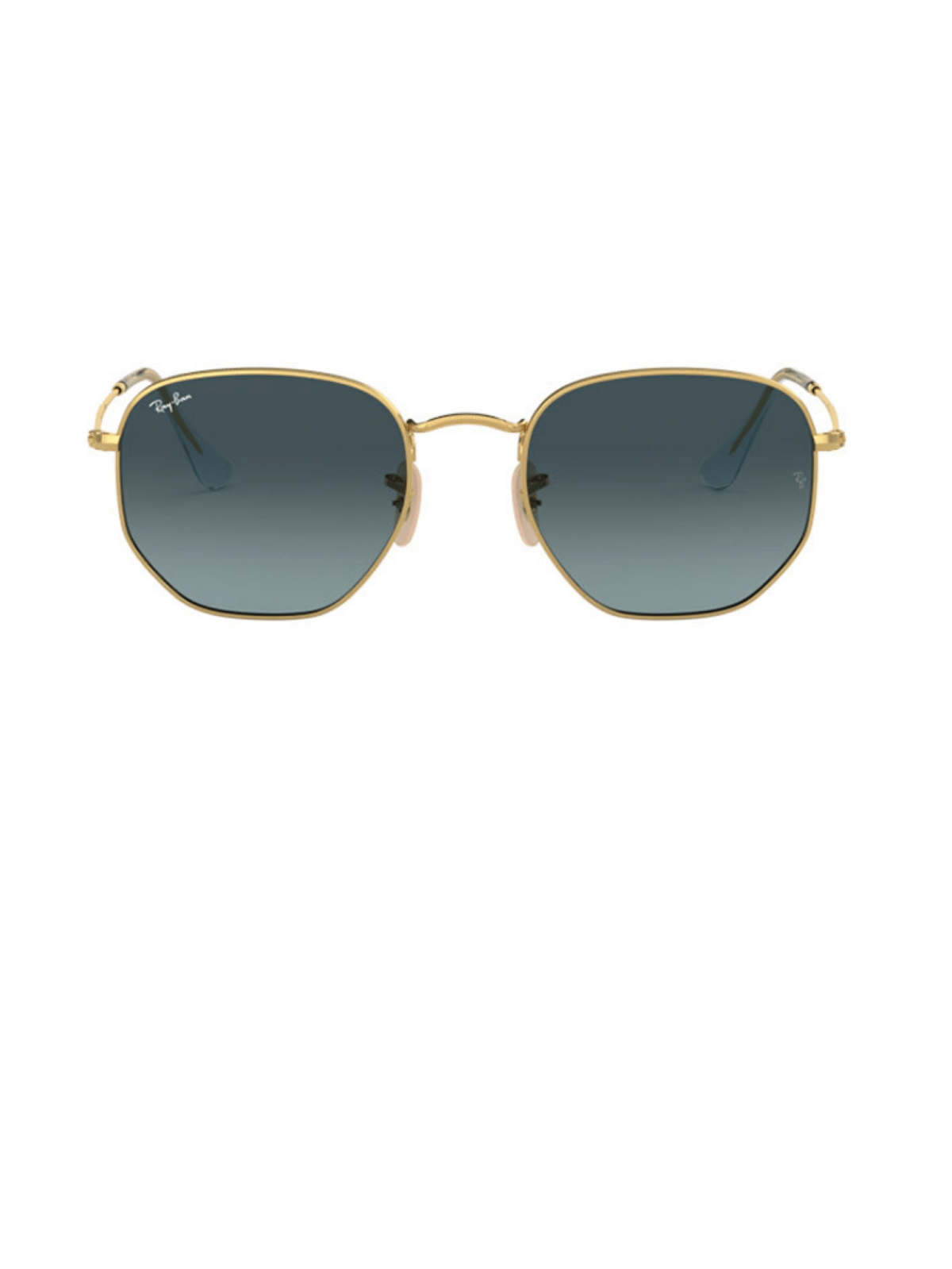 Культовая модель HEXAGONAL от Ray Ban, в металлической оправе золотого цвета с голубовато-градиентной линзой.