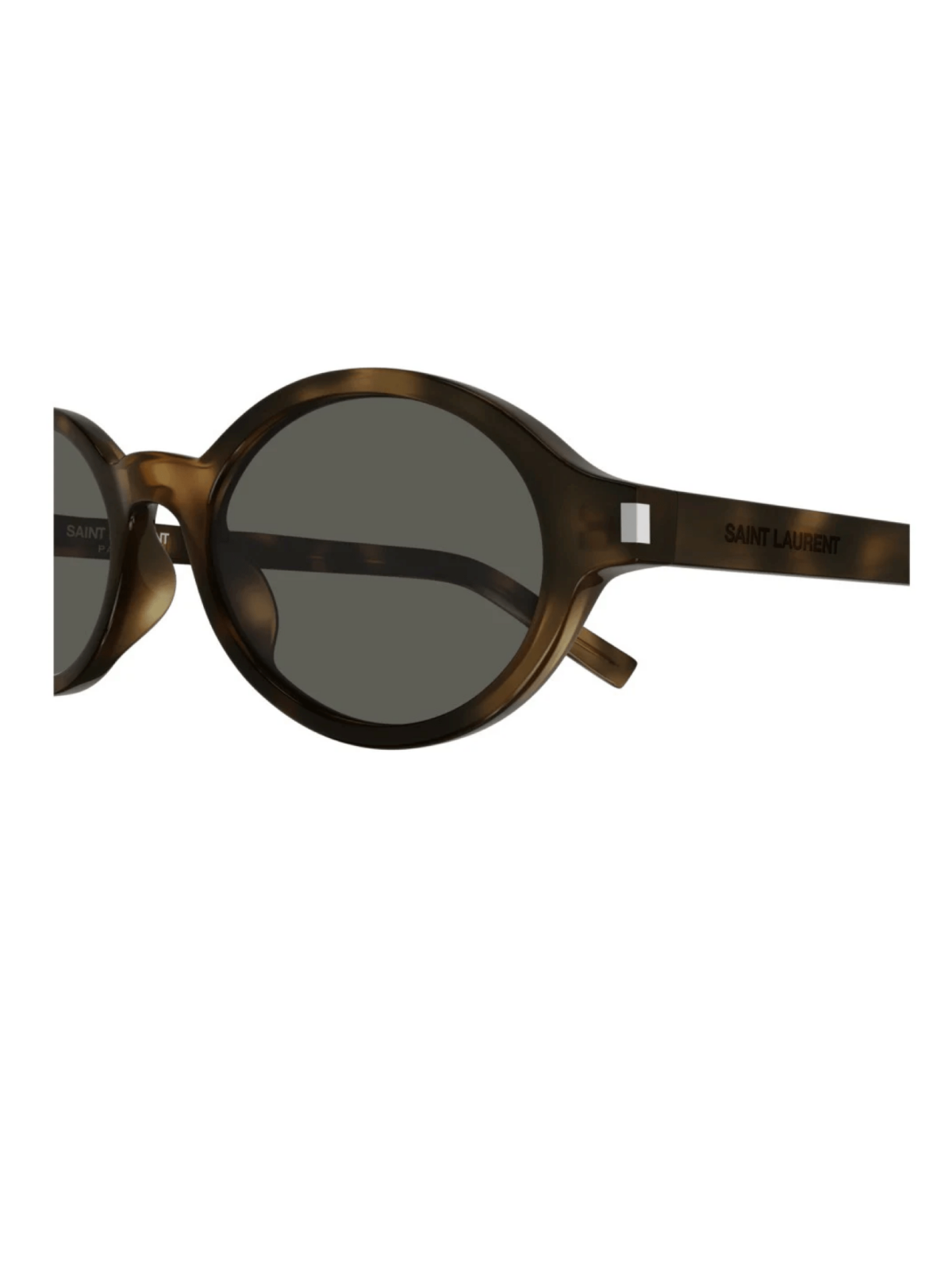 Овальная форма от Saint Laurent, в роговом цвете оправы с серо-зеленой линзой.