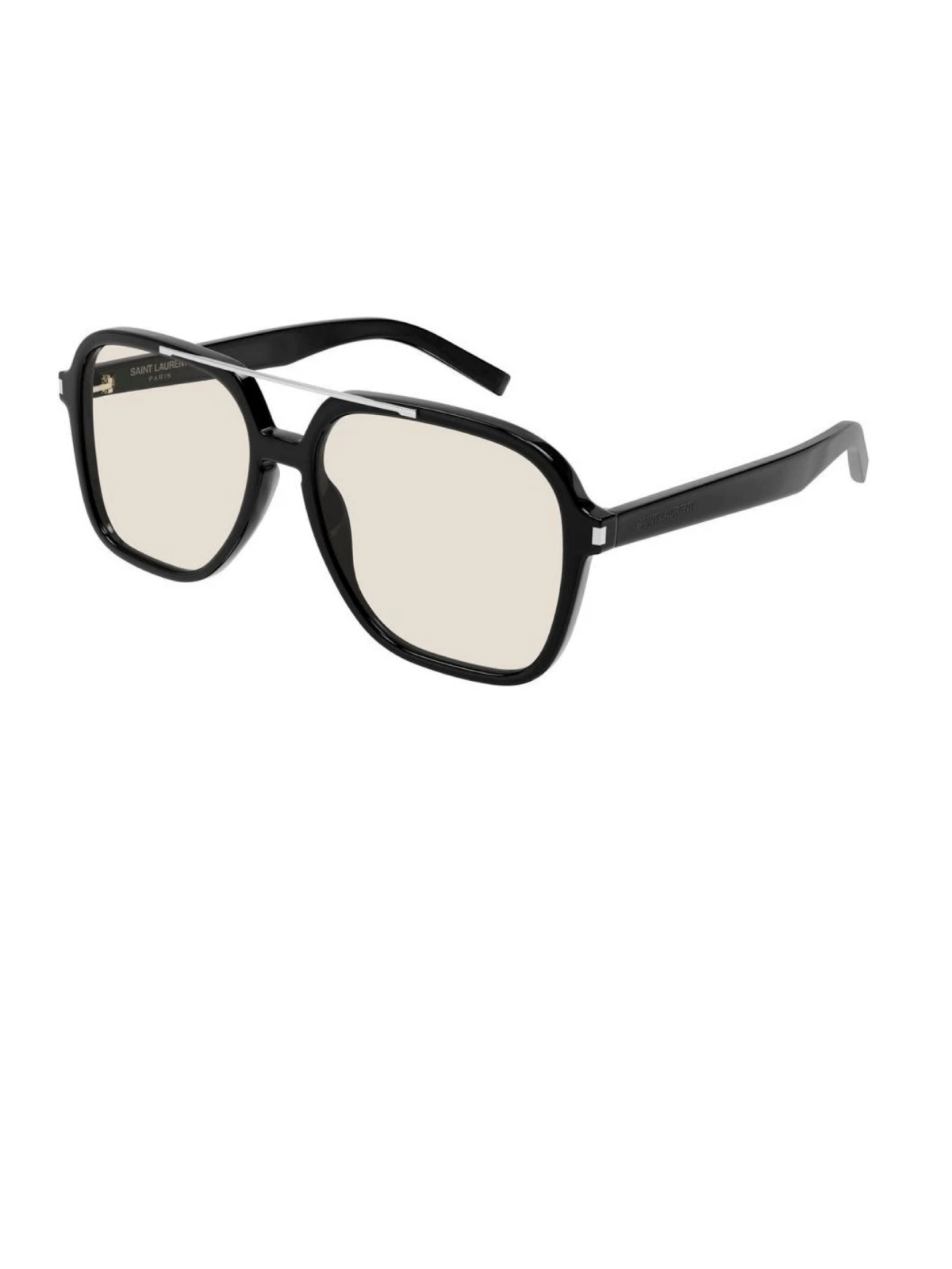 Классическая форма авиатора от Saint Laurent в черном цвете оправы, с полупрозрачной линзой.