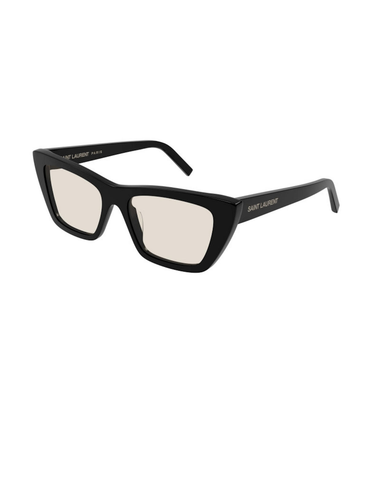 Солнцезащитные очки с чётким прямоугольным силуэтом, однотонными карамельными линзами и ацетатной оправой в черном цвете.