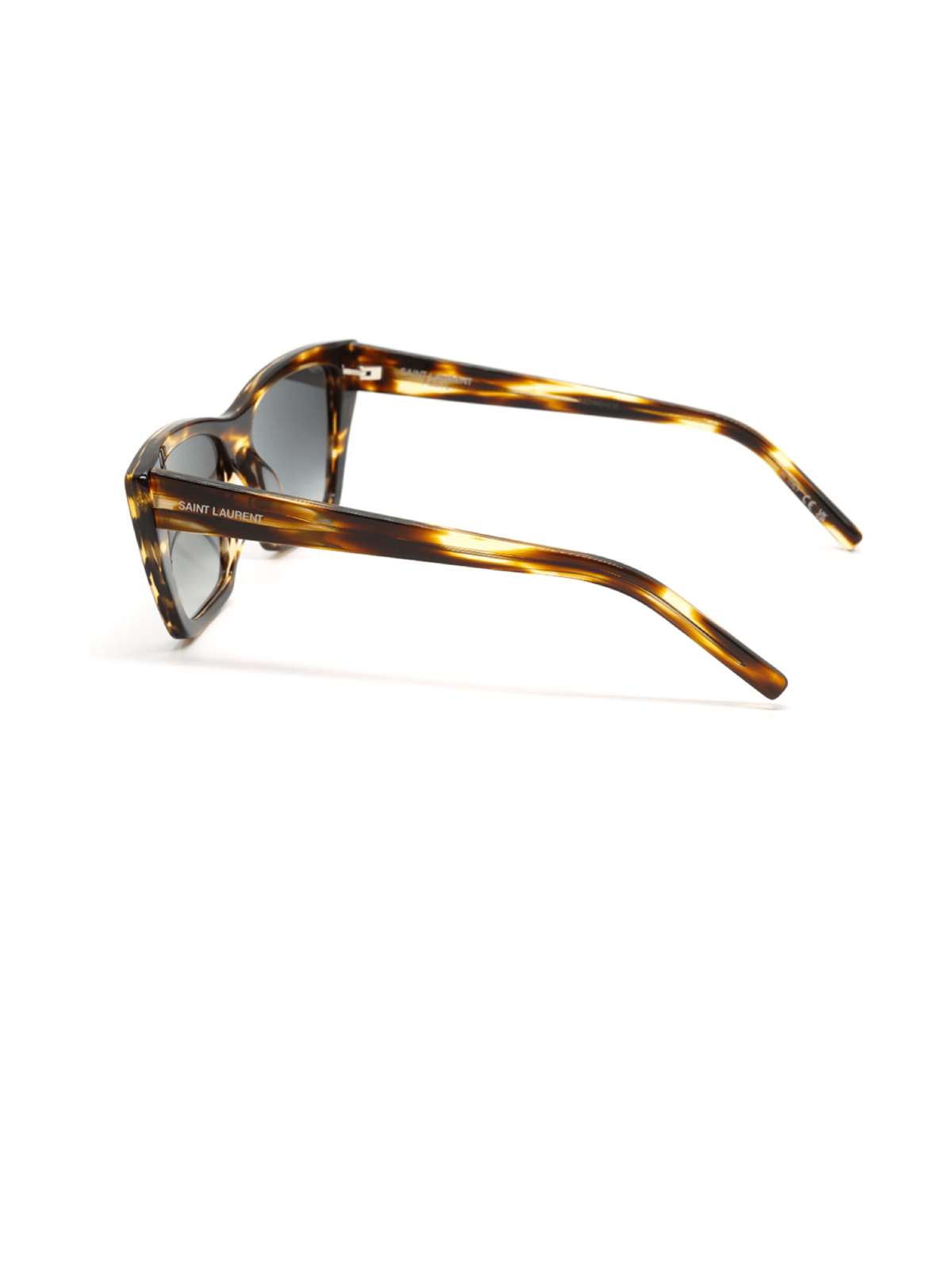 Хитовая модель от Saint Laurent – ​​Mica, классический силуэт кошачьего глаза, в пятнистой оправе, с серой градиентной линзой.