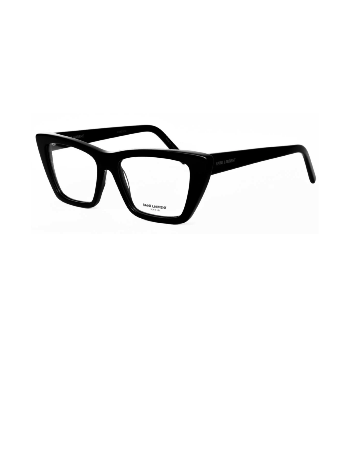 Модель в пластиковой ацетатной оправе, в форме кошачьего глаза, черного цвета, с демонстрационной линзой.