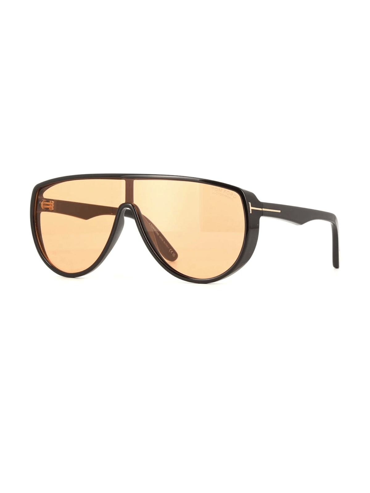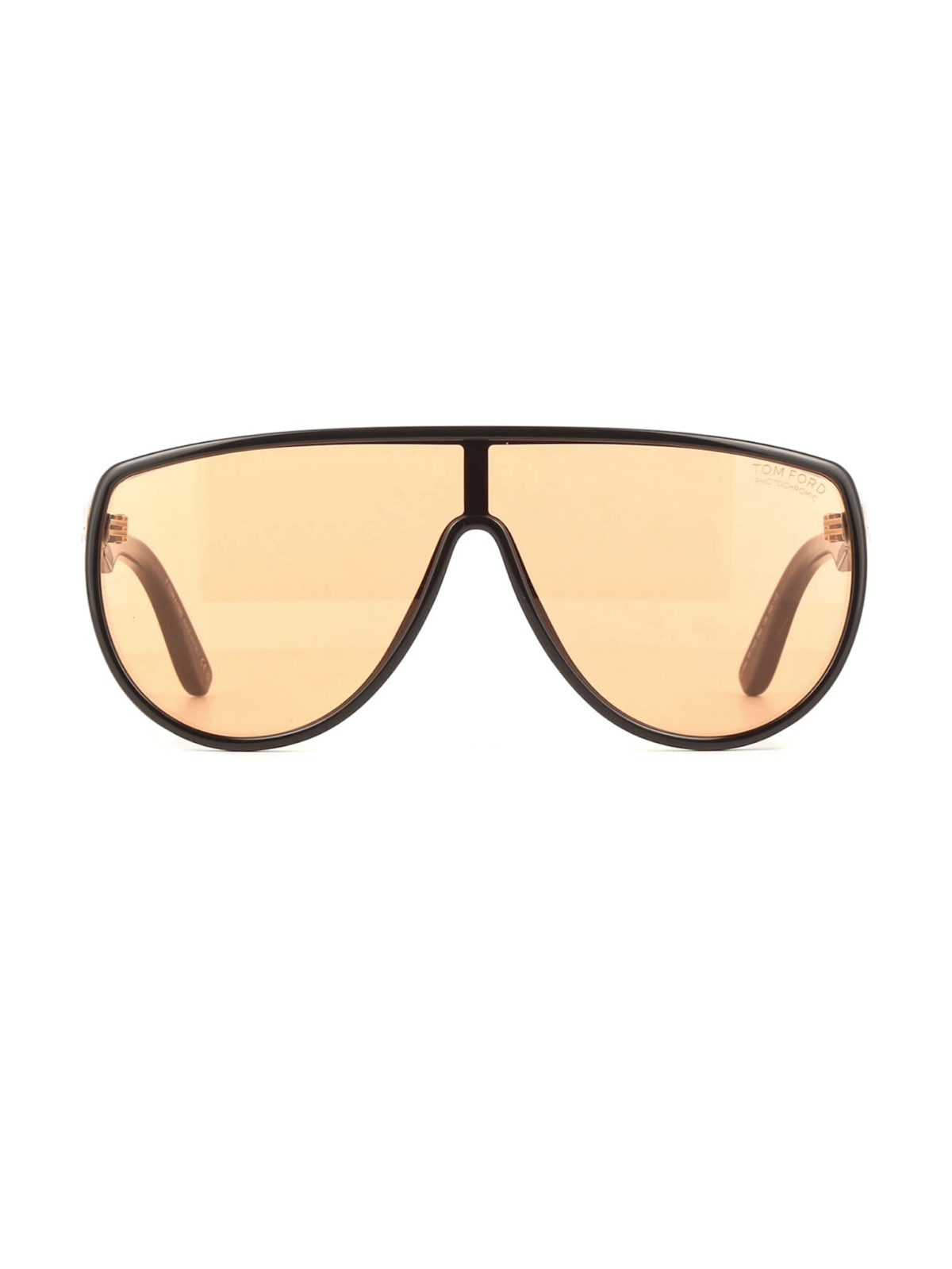 Модель имеет масковидный силуэт с цельной верхней линией линзы. Оправа черного ацетата с прямыми скобками и фирменной Т-деталью Tom Ford. Линзы фотохромные, в светлом состоянии прозрачно-оранжевые, темнеют под воздействием ультрафиолета, обеспечивая полную UV-защиту.