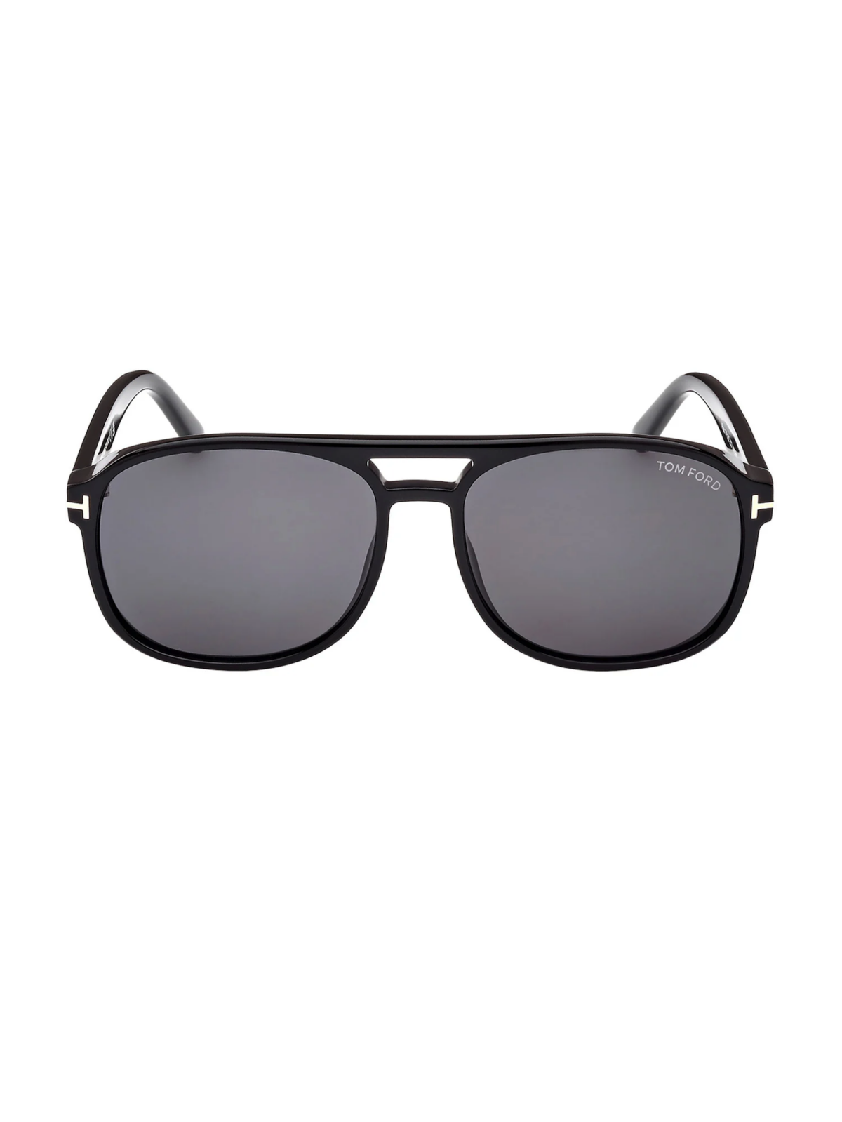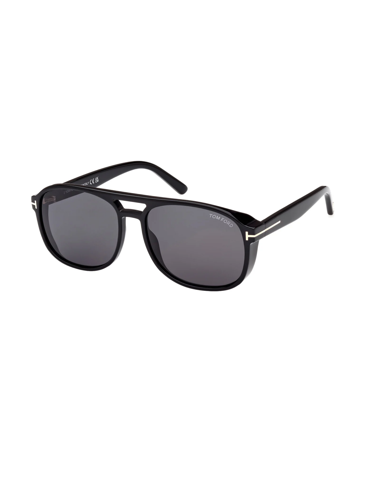 Модель имеет силуэт авиатора с двойной перемычкой. Оправа изготовлена ​​из ацетата и имеет черный цвет. Линзы темно-серого оттенка. На скобках – фирменная Т-деталь Tom Ford.