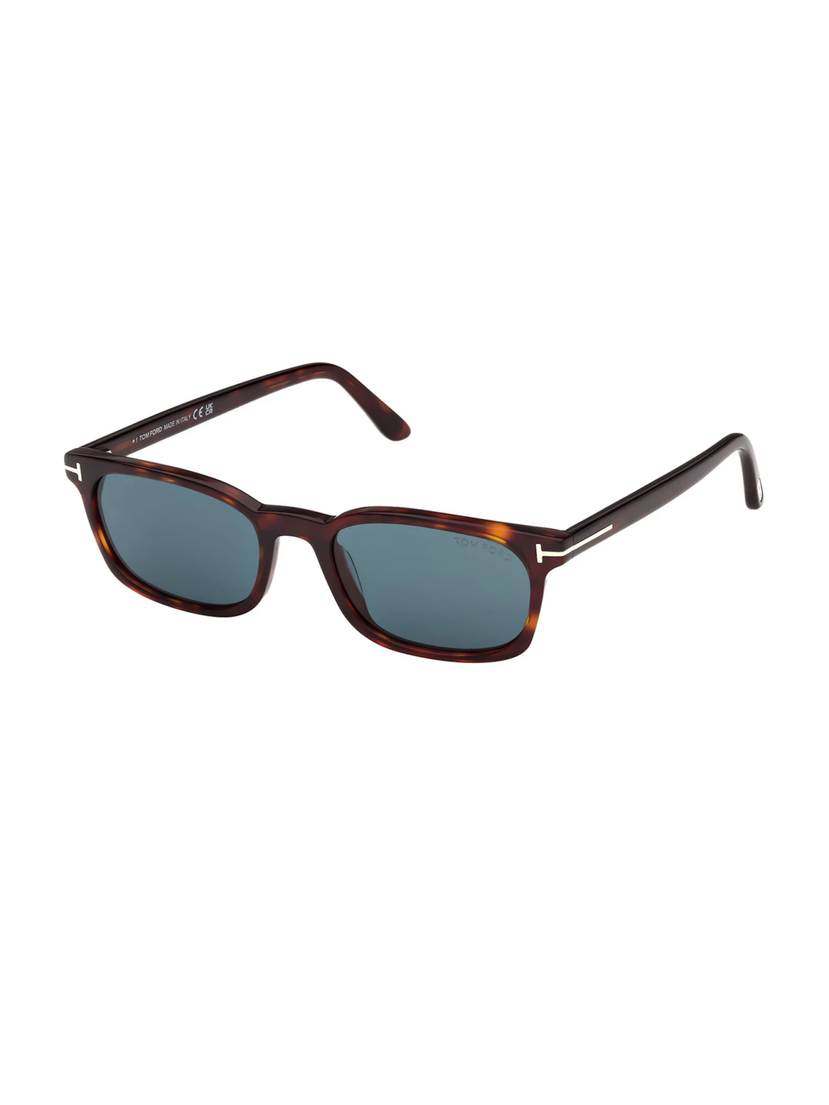 Солнцезащитные очки с чётким прямоугольным силуэтом, однотонными синими линзами и ацетатной оправой в тёплом Red Havana оттенке, сочетая элегантность и современный минимализм.