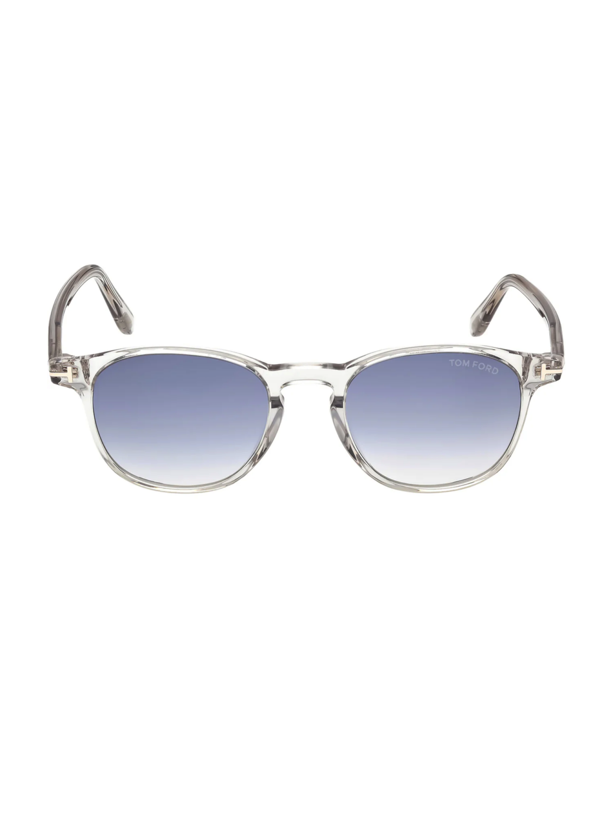 Солнцезащитные очки с мягким округлым силуэтом, градиентными синими линзами и глянцевой оправой серого цвета из ацетата.