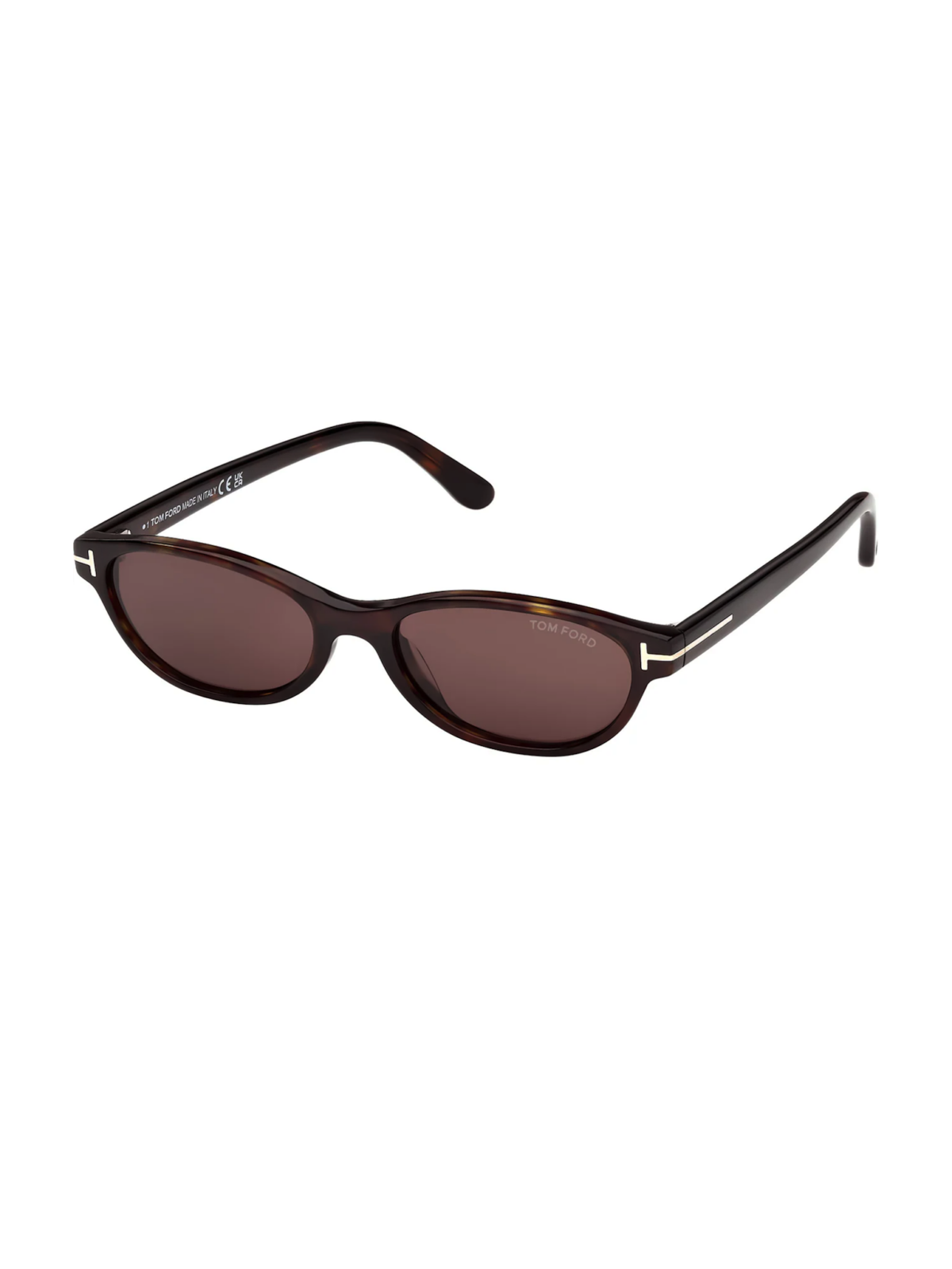 Cолнцезащитные очки с элегантным cat-eye силуэтом, однотонными коричневыми линзами и глянцевой тёмной Havana оправой с фирменной металлической T-деталью на дужках
