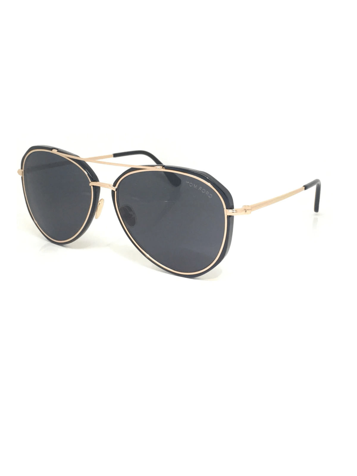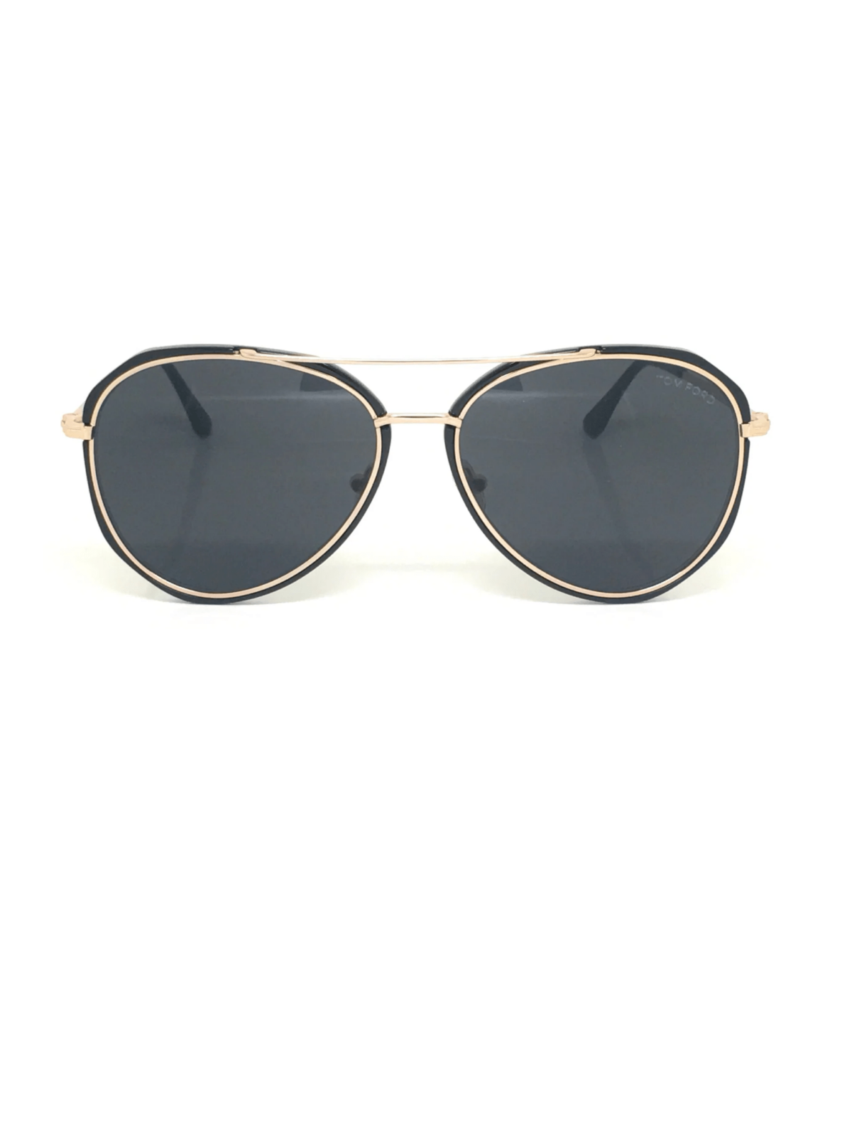 Мужская классика от Tom Ford модель в форме авиатора с серо-голубой линзой в металлической оправе золотого цвета.