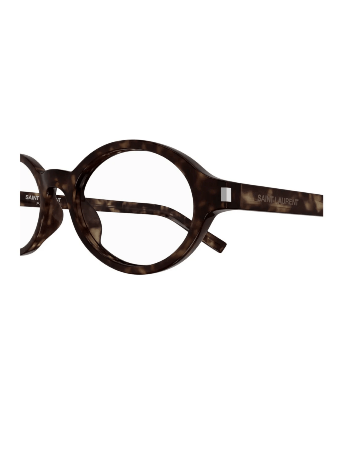 Овальна форма оправи від Saint Laurent, в роговому кольорі.