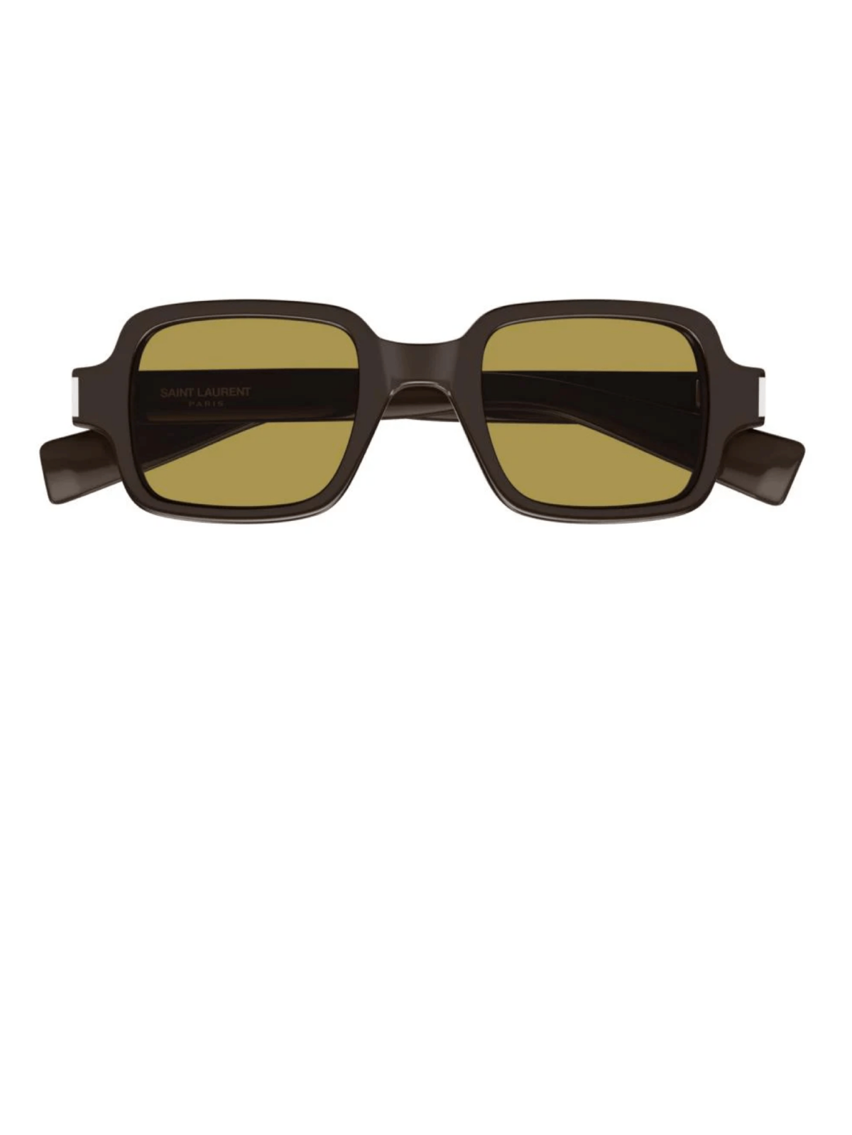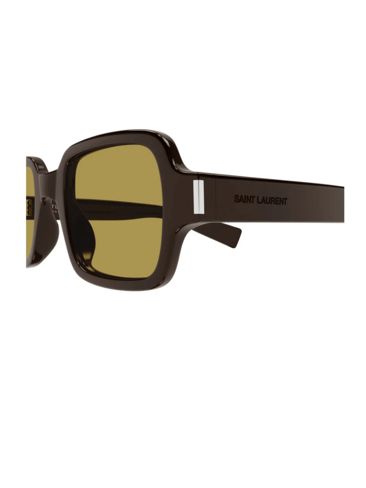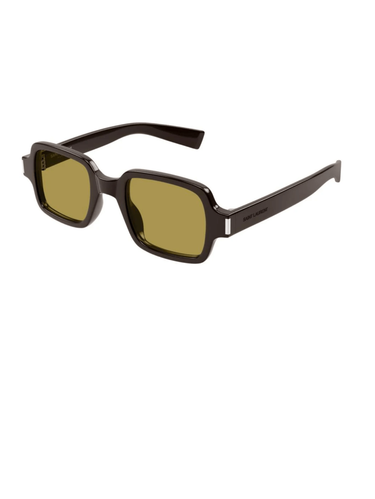 Стримана квадратна форма у стилі ретро, в коричневому кольорі оправи з жовтою лінзою.