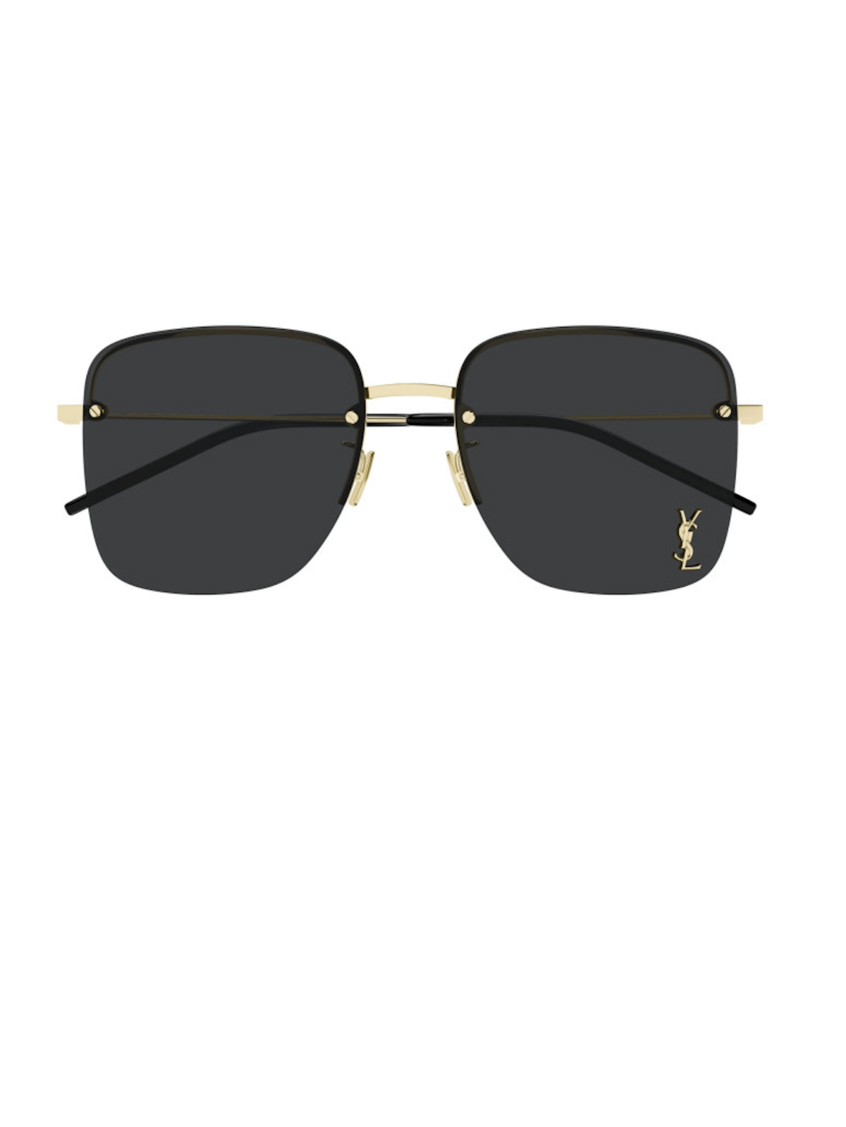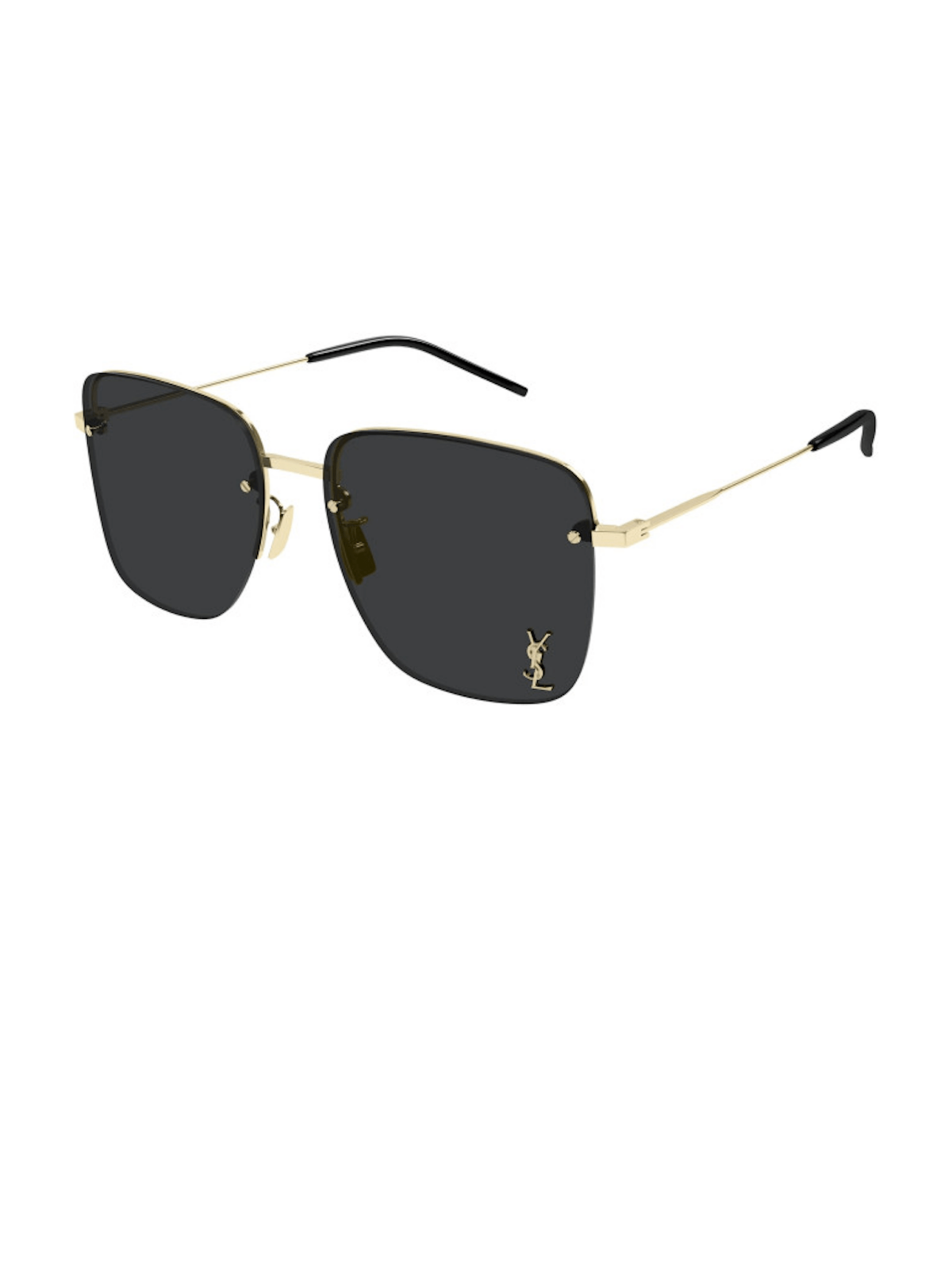 Сонцезахисні окуляри з чітким квадратним силуетом, однотонними чорними лінзами та тонкою металевою золотистою оправою із напівободковою конструкцією.