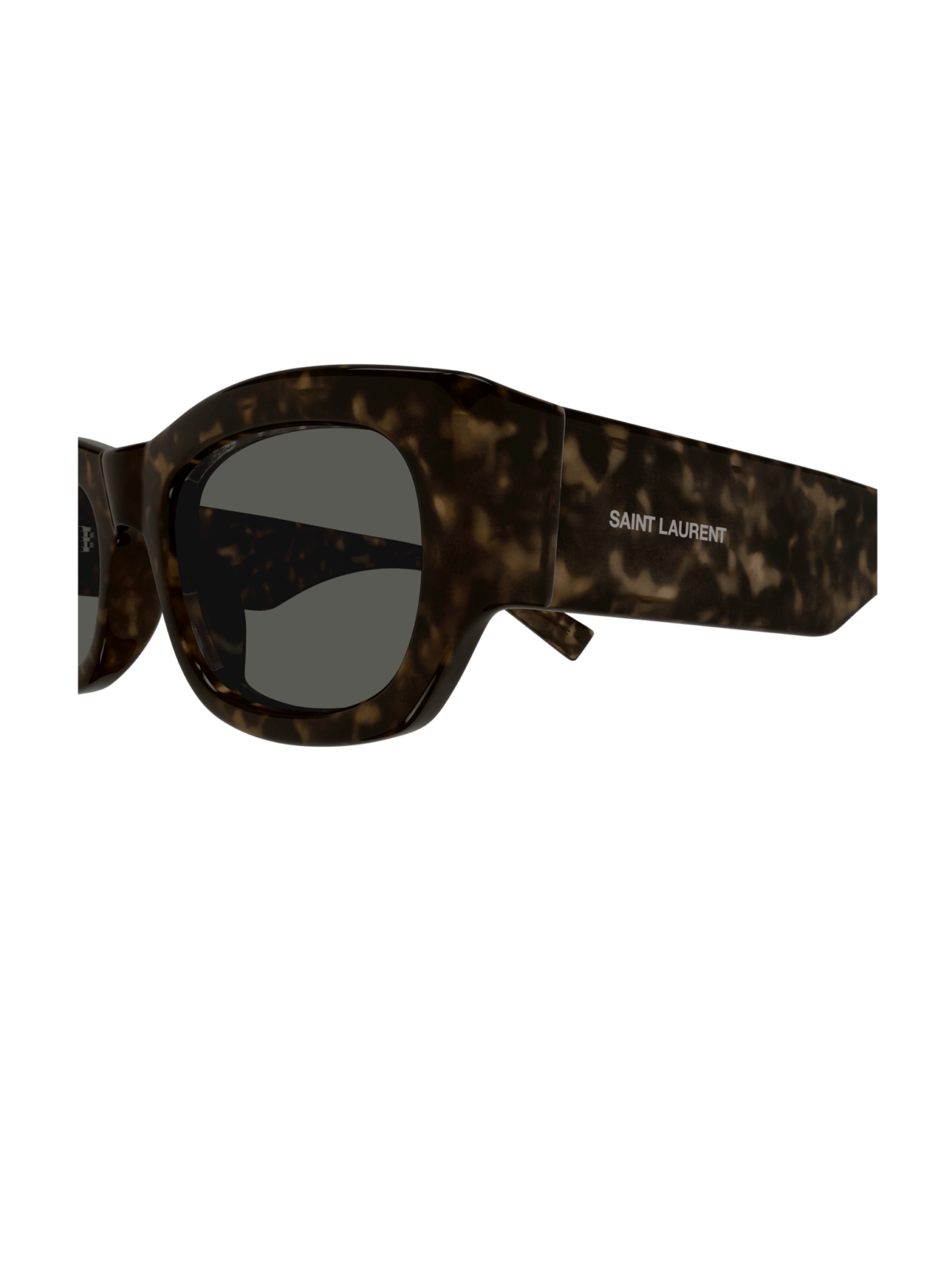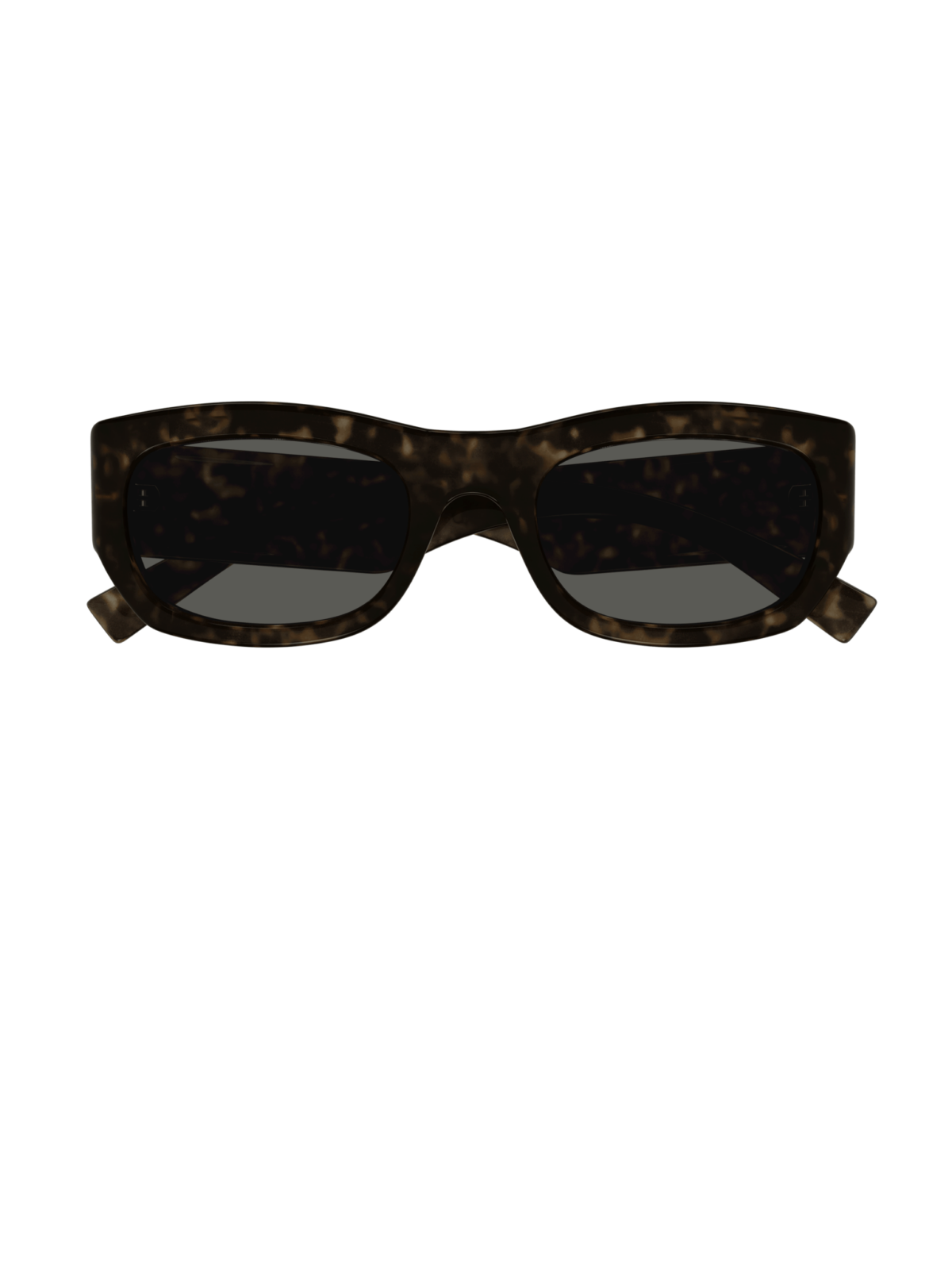 Модель в округлому силуеті з сіро-зеленою лінзою, в роговій оправі.
