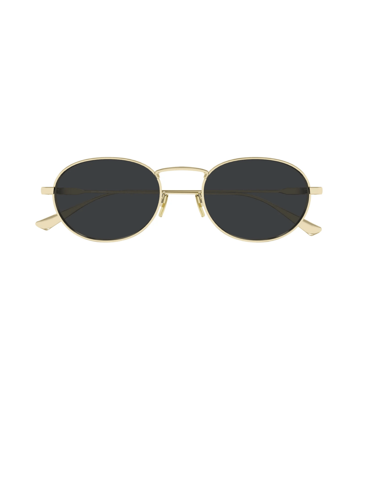 Сонцезахисні окуляри з м’яким овальним силуетом у стилі 90-х, однотонними темно-сірими лінзами та тонкою металевою оправою у золотому відтінку. Лаконічна форма з плавними лініями та мінімалістичним подвійним мостом створює легкий, витончений образ у дусі Saint Laurent.