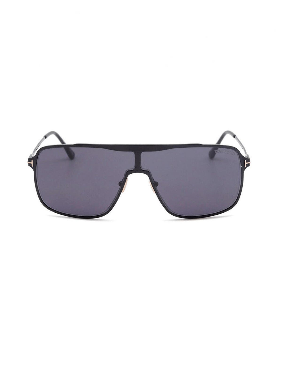 Модель має прямолінійний авіаторний силует з єдиною панеллю лінзи у верхній зоні. Оправа виконана з тонкого чорного металу, дужки також металеві з мінімальним профілем. Лінзи темно-сірого відтінку з повним UV-захистом. Характерна Т-подібна деталь Tom Ford на шарнірах підкреслює фірмове оформлення.
